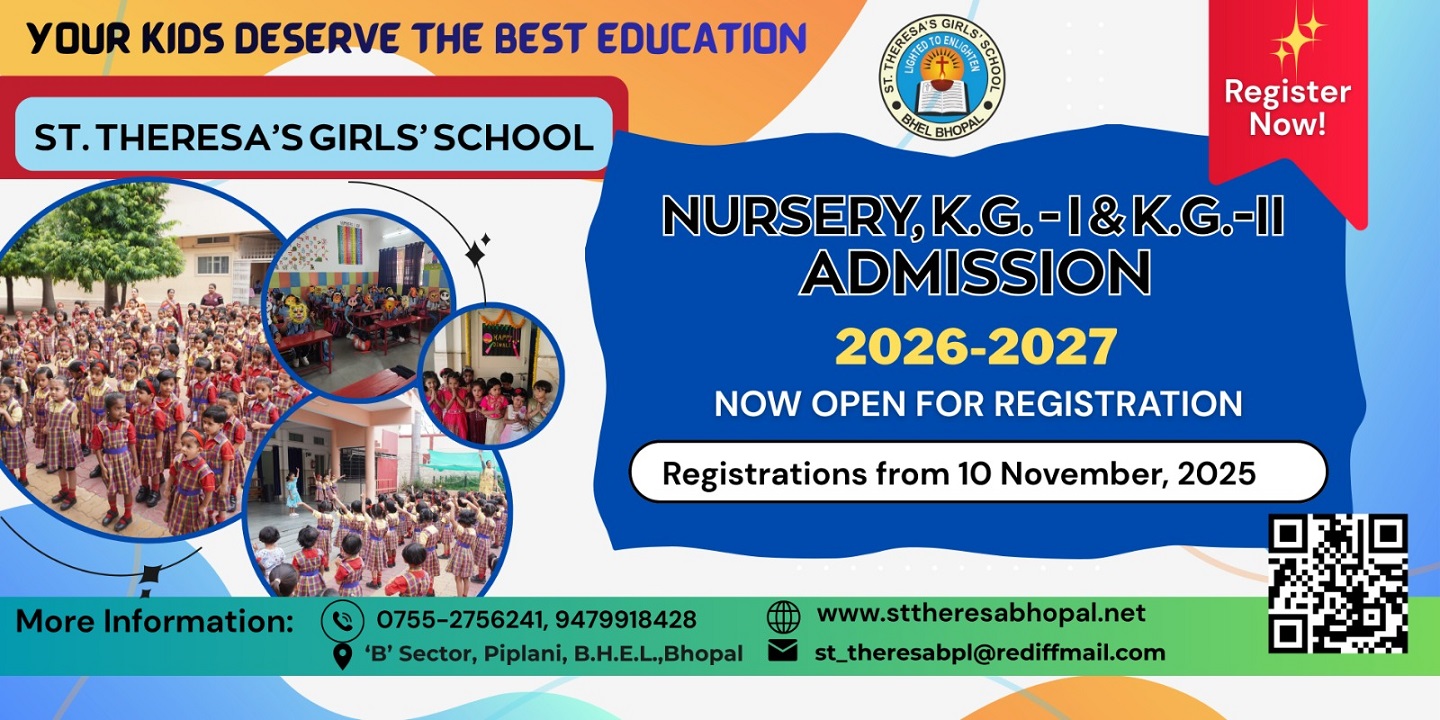 The inception of St. Theresa's Girls' School dates back to July 1982. It was established by the Sisters of the Cross of Chavanod. The School is situated on a 5 acre plot in Piplani, sanctioned on lease by the B.H.E.L authorities. The School has grown up slowly and steadily and presently has to its credit 65 staff members and 1800 students on roll.